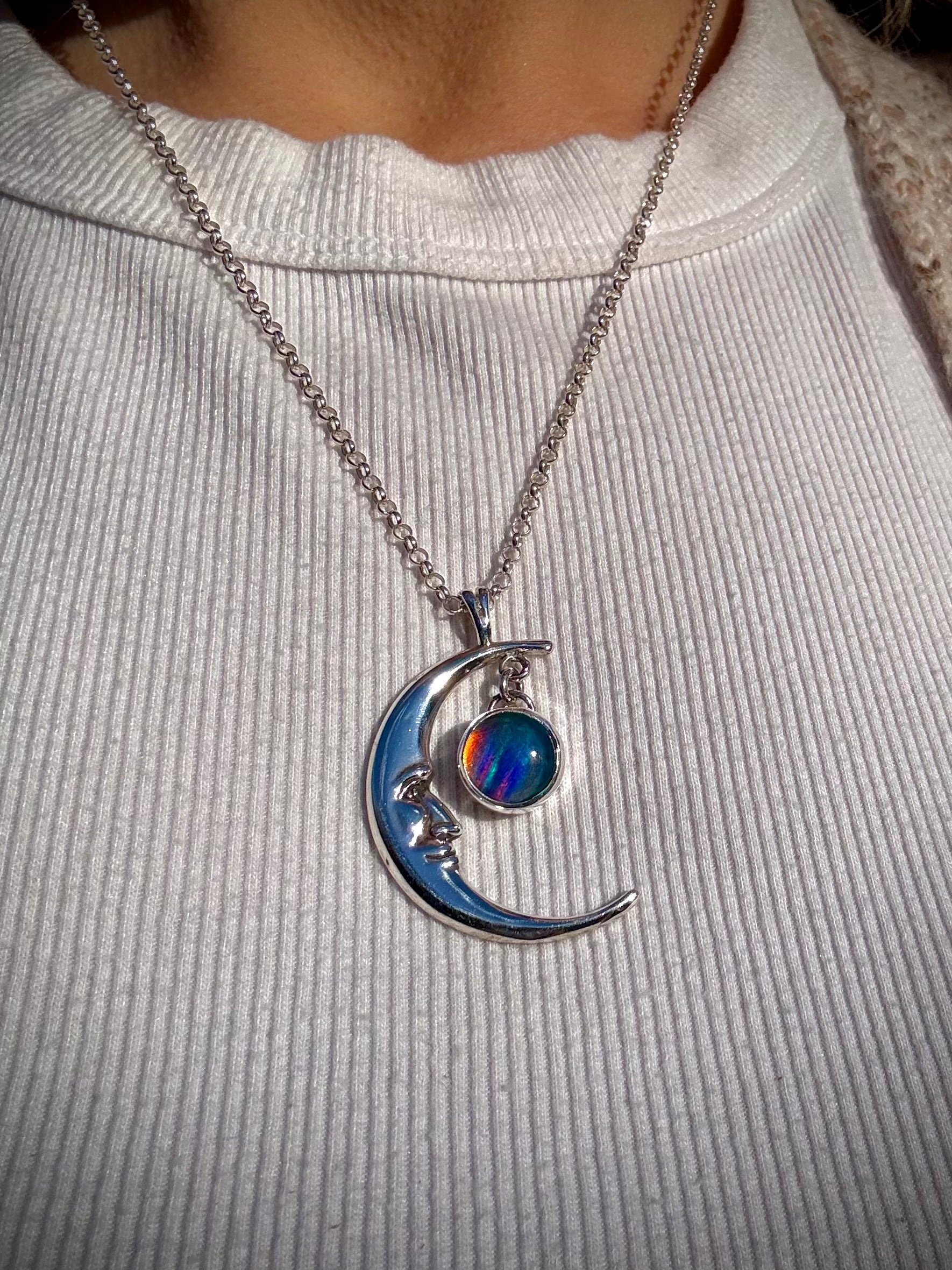 This aura opal doublet with clear quartz over top has a fantastic shimmer. Blue/green at one angle and pink/purple at the other. The opal dangles from the very tip of the man in the sterling silver moon! The moon is hung from a 20” rolo chain.