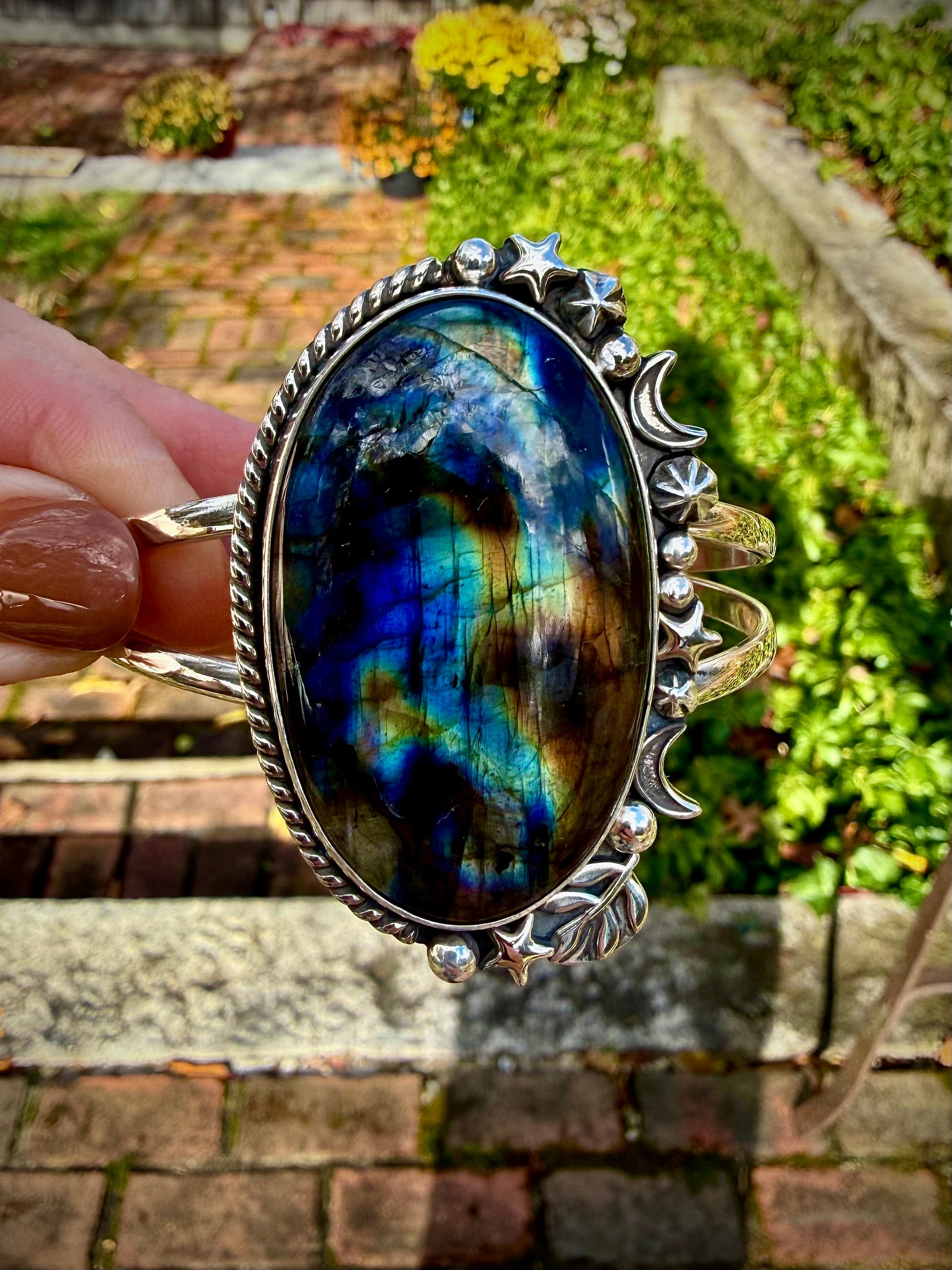 This flashy labradorite cuff is a big one! The stone itself measures 2”. The stone is surrounded by sterling silver moons and stars giving a mystical vibe to the whole piece! The flash in this stone is just beautiful. The stone and stars are set on a double banded sterling silver cuff. This would best fit small to medium sized wrists, but is somewhat adjustable.