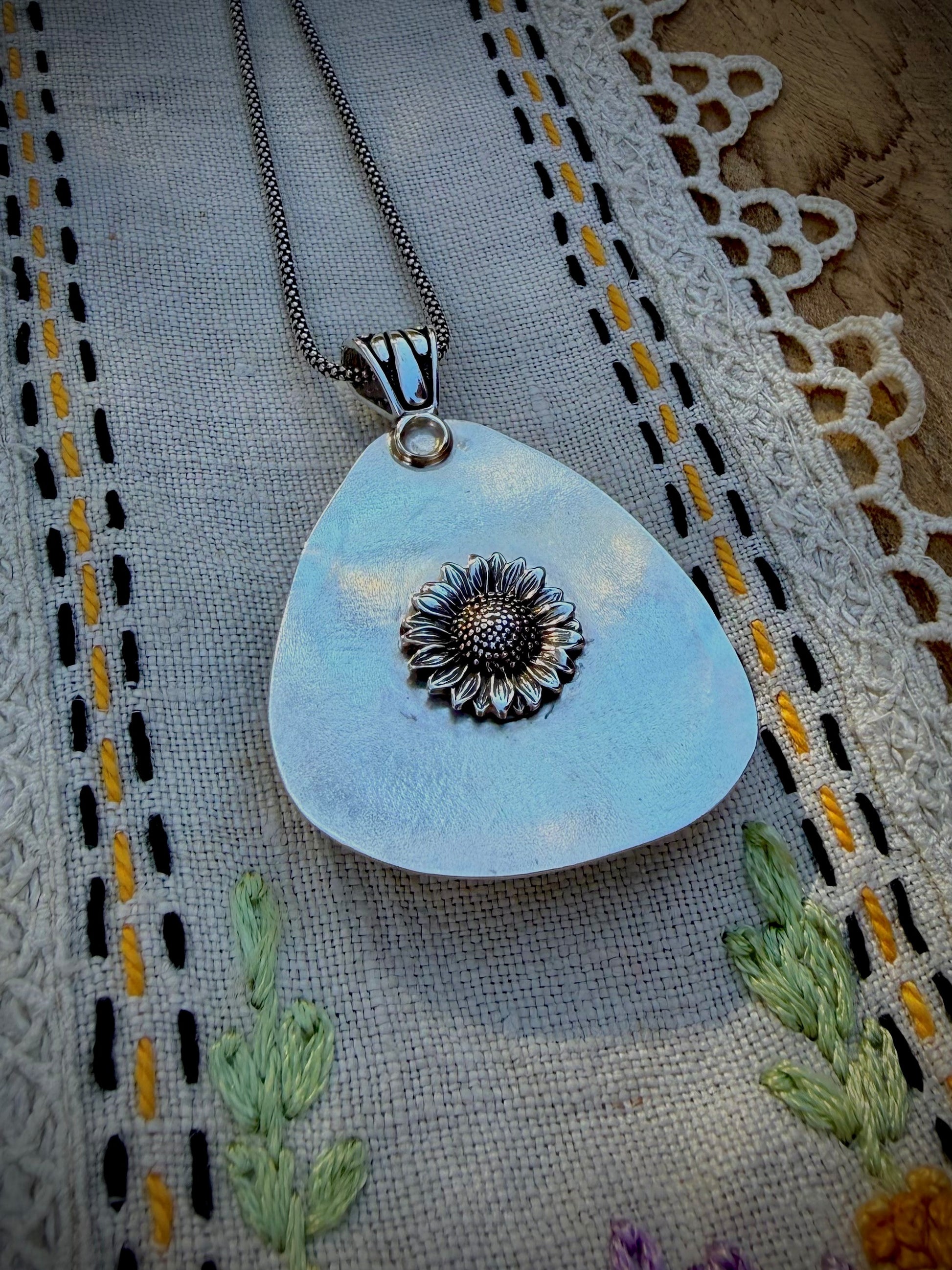 This necklace makes a statement... that's for sure! This chunky, faceted rainbow labradorite is set in solid sterling silver prongs that compliment the freeform shape of the stone. The pendant is set on a 20" oxidized sterling silver chain. The pendant, with bail, measures just over two inches. This means the total length of the necklace, while worn, is about 22.5". There is a lovely sterling silver sunflower surprise on the back.