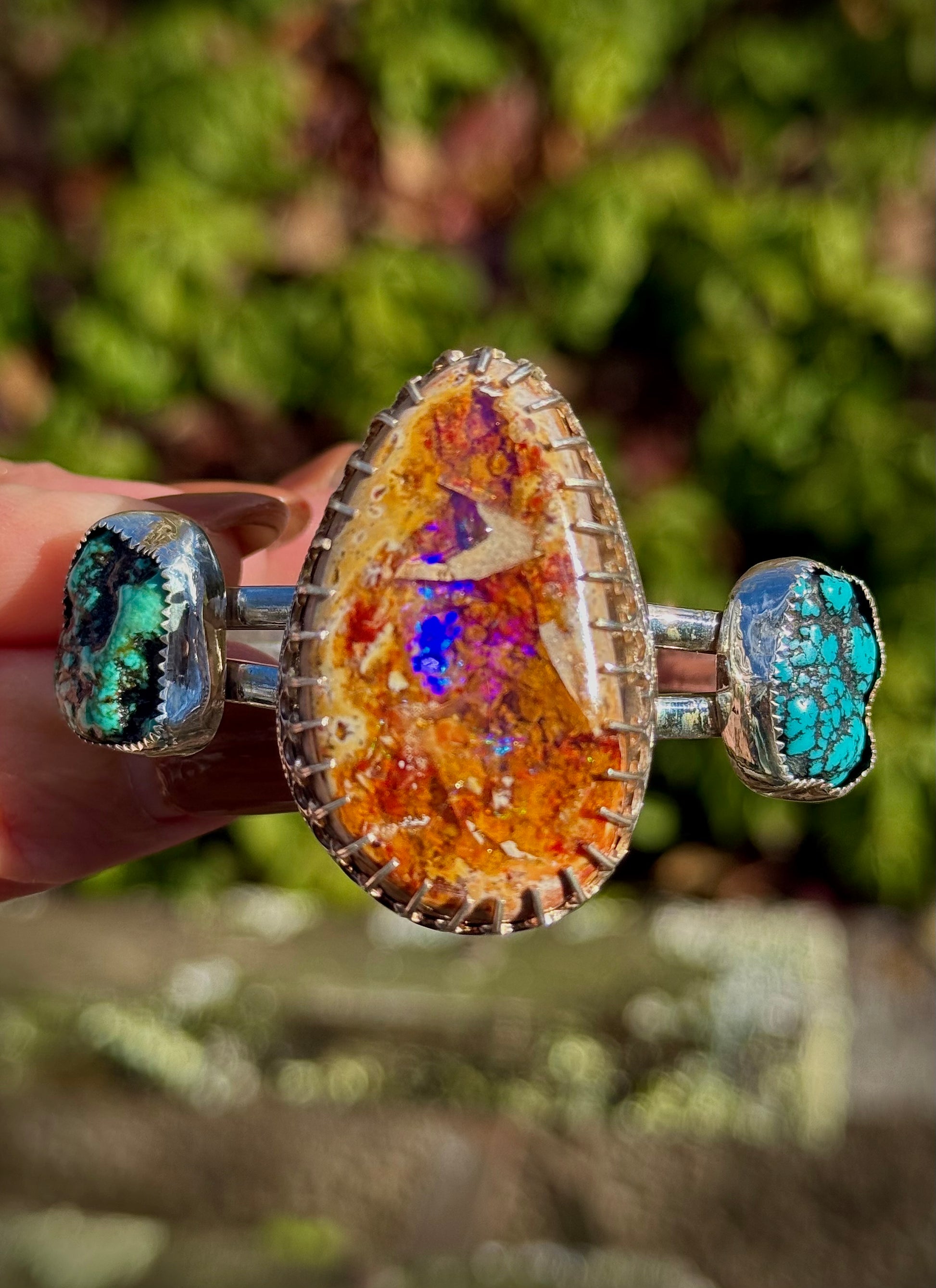 This Mexican fire opal, though difficult to photograph, literally has an entire world inside of it! The depth, the colors, the shimmer… perfection! The fire opal is set in between two raw turquoise nuggets. The cuff is a double style band in solid sterling silver. For medium to large wrists, though somewhat adjustable.