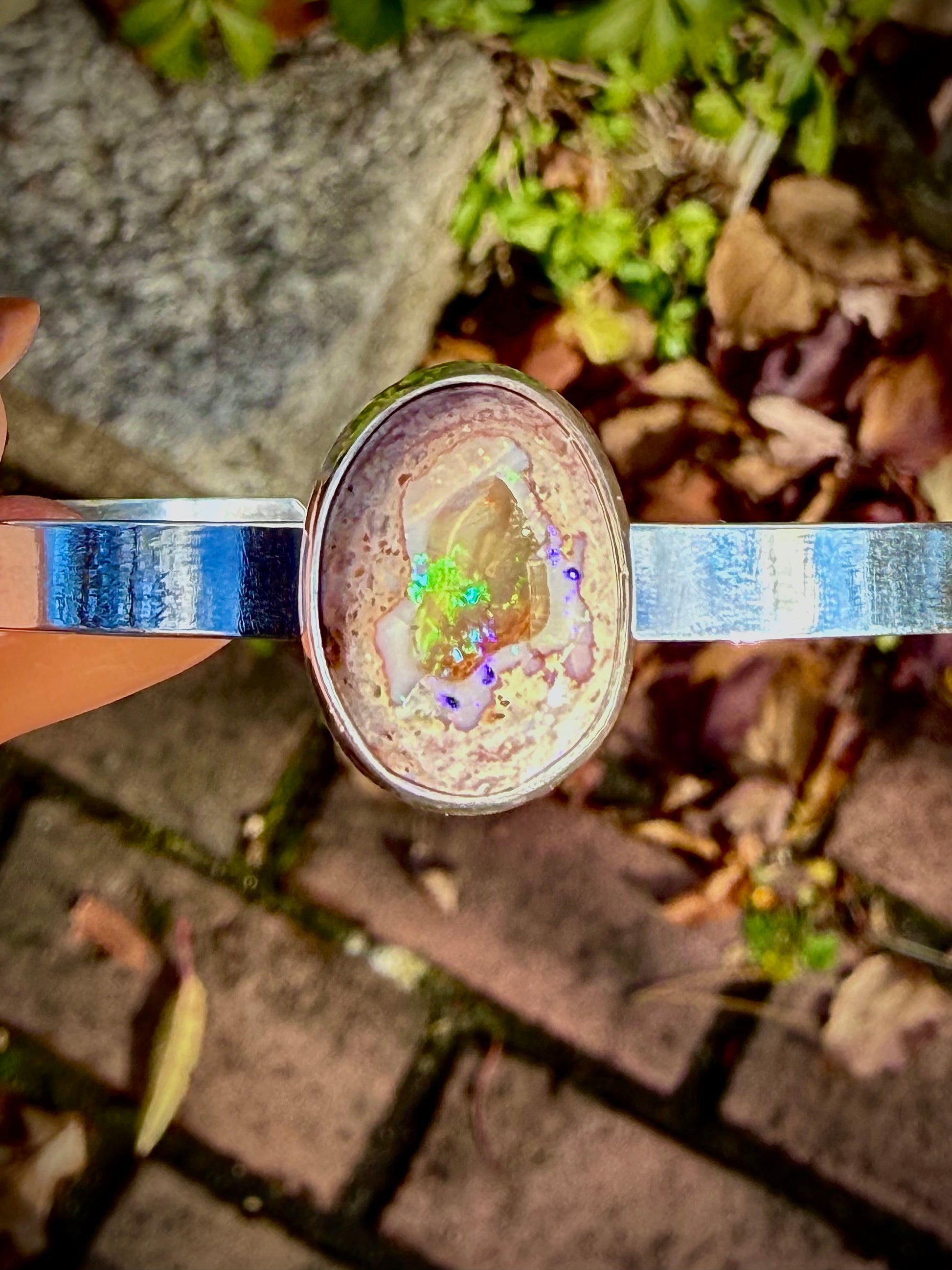 This little opal is another one tricky to photograph! Straight through the center there is a clear and shimmery window into the middle of the stone. You can see shimmery flashes of pinks and greens. The opal is set, simply on a rectangular sterling silver cuff. It can be purchased as a stacking set with the other cuff in the photo, or on its own. This listing is for the opal cuff only. If you’d like to make a stack, please reach out before ordering.