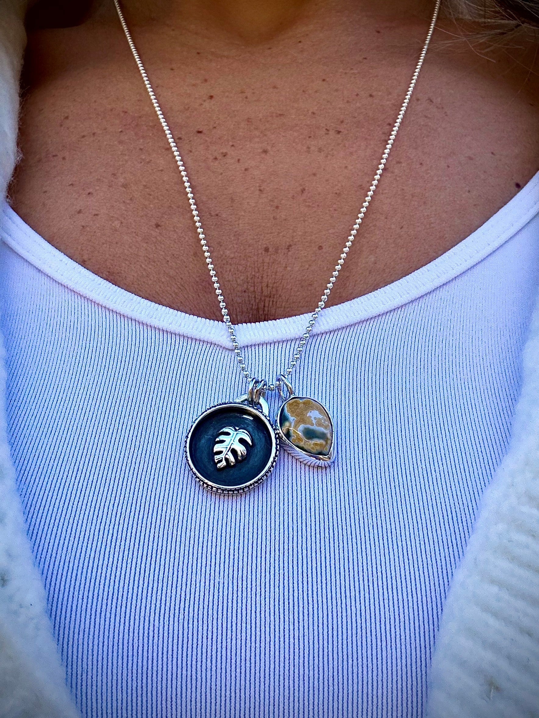 This dainty little charm necklace is for all my plant people out there! A sterling silver monstera charm dangles next to a piece of ocean jasper. The charms can be worn together or separately. The charms hang on a long 24" sterling silver ball chain, which is long enough to slip over your head without undoing the clasp.
