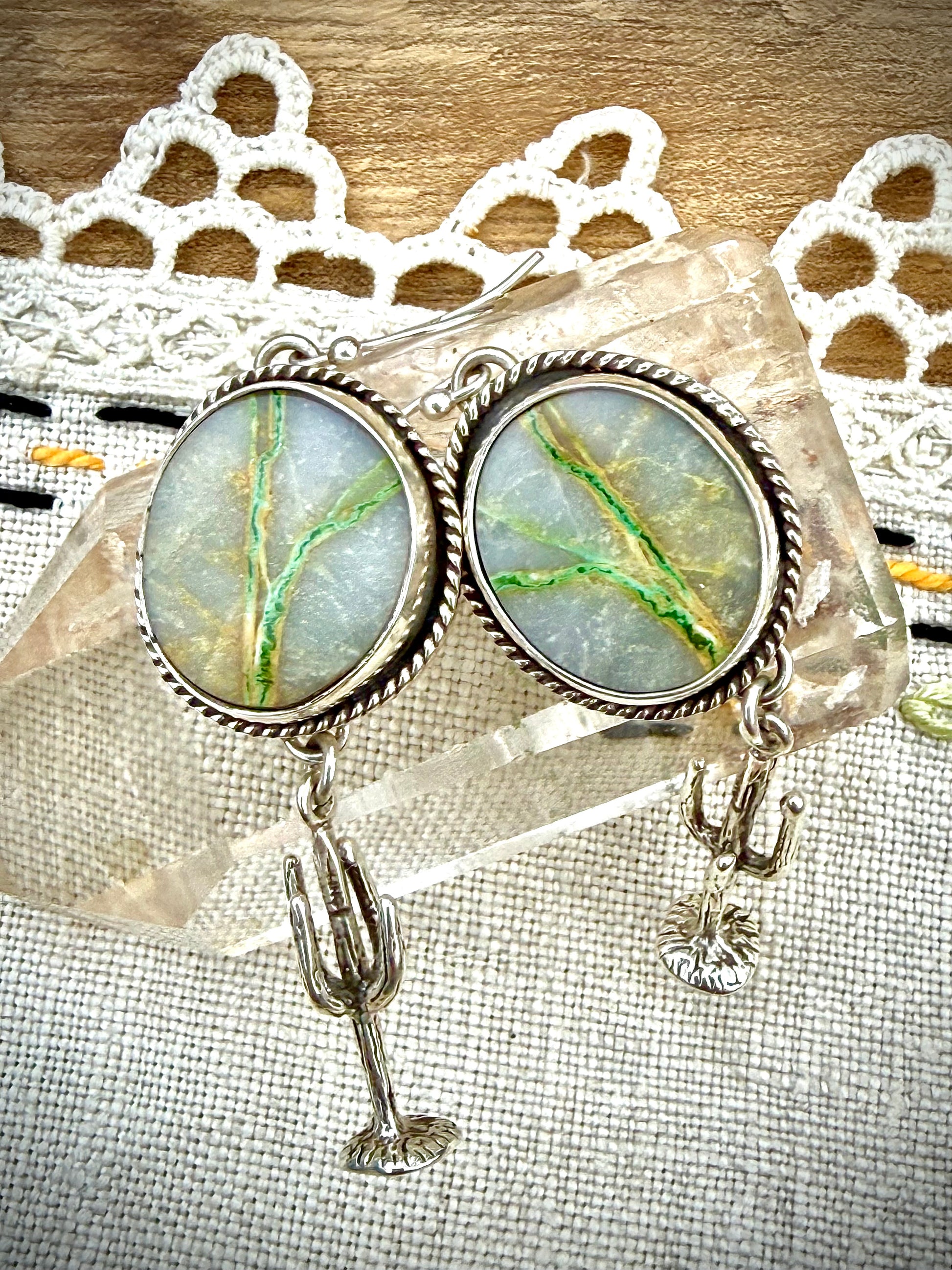 These might be one of my favorite pairs of all time! I have not often seen this color combination in the Royston ribbon stones! It just looks like a little river of green winding through. The stones are set in sterling silver, with cast sterling silver Saguaro cacti dangles. Very unique and truly one of a kind.