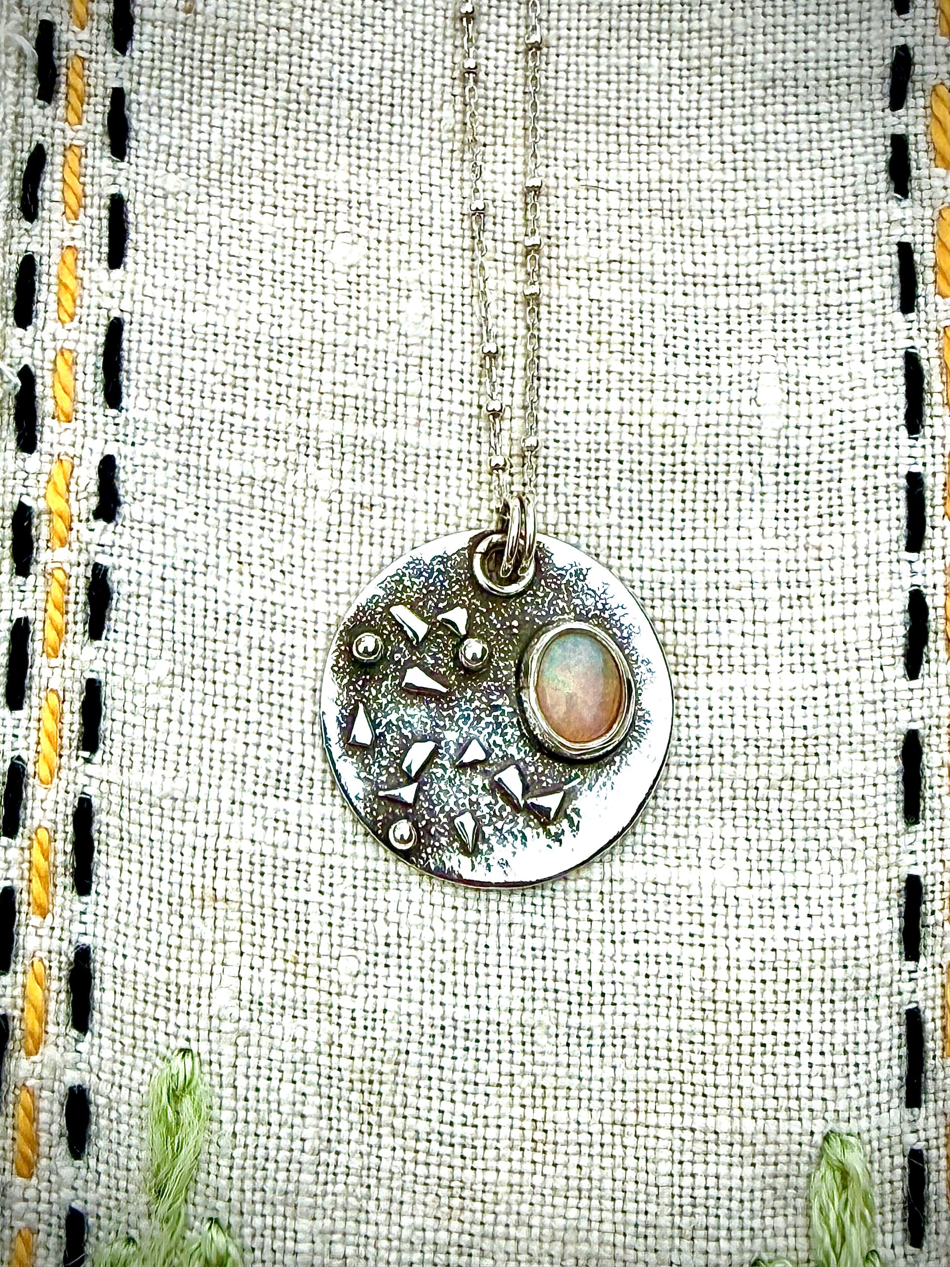 This abstract piece was created using mostly scrap silver pieces from my studio. I added a beautiful little Ethiopian opal with the most subtle rainbow iridescence. This hangs from a short 16” sterling saturn chain.