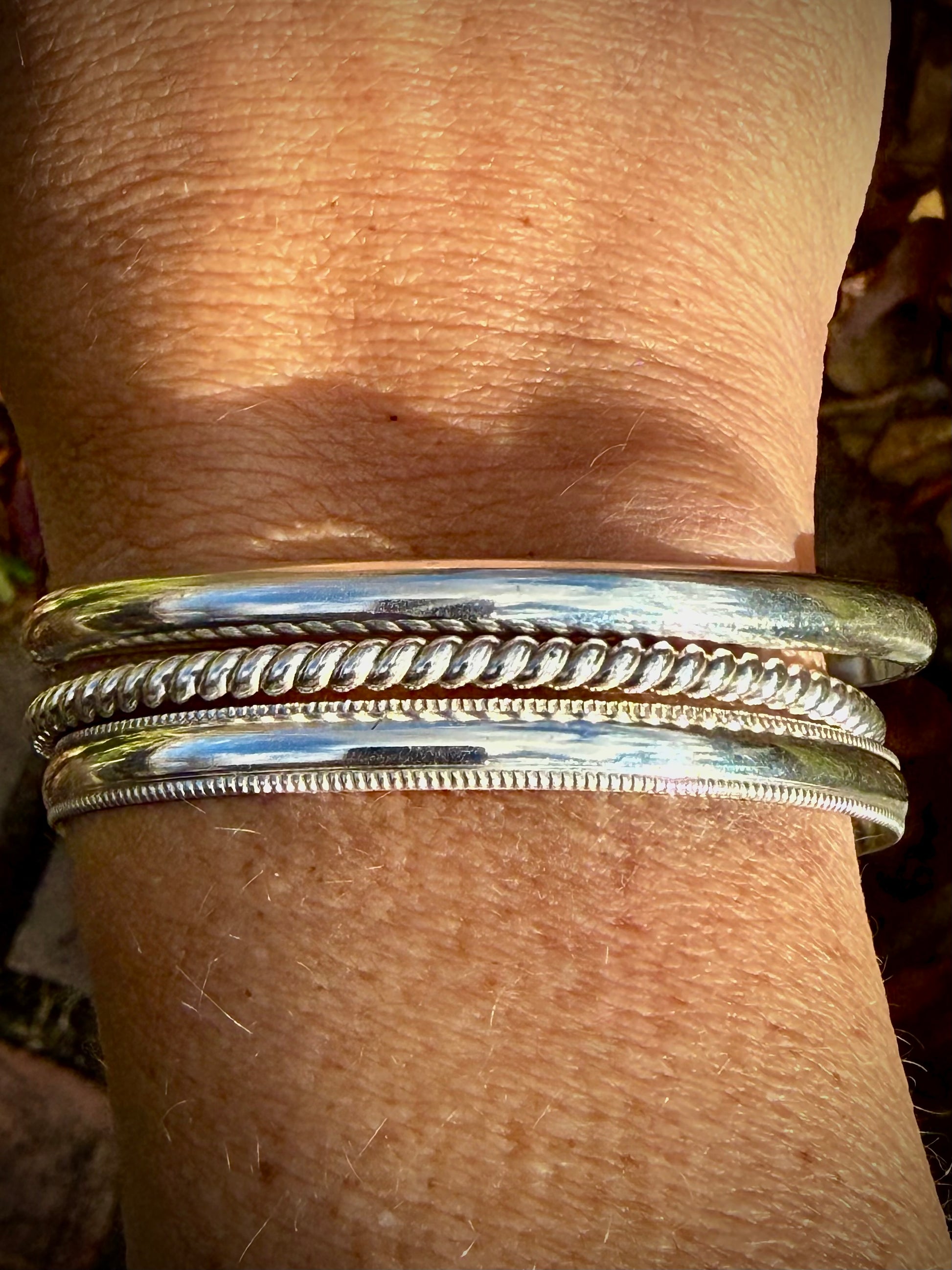 This sterling silver simple cuff has a twisted rope look… not too thick but not too thin! It’s a great addition to any bracelet stack or perfect on its own. This is a made to order item and can be customized to fit your wrist. If you would like this sized in a particular way, please reach out before ordering. This cuff can be purchased on its own, or part of a stack. If you would like to bundle this bracelet with others, please reach out before ordering. I can likely give a discount if you are purchasing multiple stacking cuffs at once.
